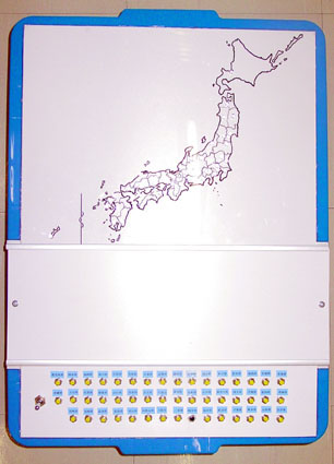 47都道府県名とその位置が全国どこでもボタン一つでわかります。また、裏の配線やボタンの上につけられた都道府県名のシールなど、苦労のあとが見られる作品です。