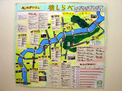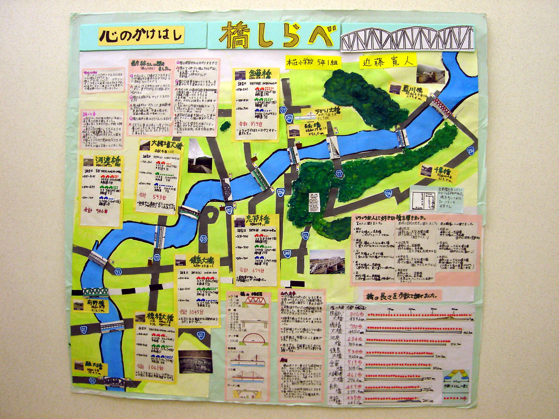 自分の好きなことを地図で表現しようした動機がすばらしいです。歩数で川の長さを測ったり、アンケート調査を行ったりと、橋を身近に引き寄せて考えることのできる作品です。
