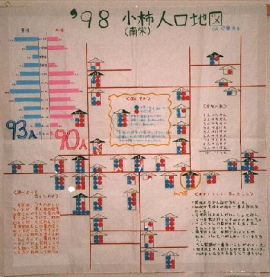 この地図は、小柿(南栄)の各家庭は、何人家族かとか、その家に住んでいる人の年れいなどを表わした地図です。青のシールが男、赤のシールが女を表わしています。この地図は、遊びに行く前の日に作ったので、夜おそくまでがんばって作りました。