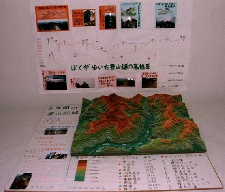 ぼくは三年間に北アルプスを登山したので、その山の立体地図を作りたかったので、がんばって作りました。まず、五万分の一の地形図を拡大コピーしたものを100mごとの等高線で色分けし、トレーシングペーパーに写し、厚紙に写し、切り取って重ねました。山を歩いた道があまりわからなかったので、ビー紙にじゅう走した道を書いて、そこから見える風景も書きました。