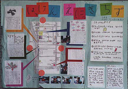 ぼくのつくったちずをもってあるいていると、たんけんをしているみたいで、うれしく なりました。ちずにいろをぬったら、もっとすごいちずになりました。どんどんたのしくなりました。